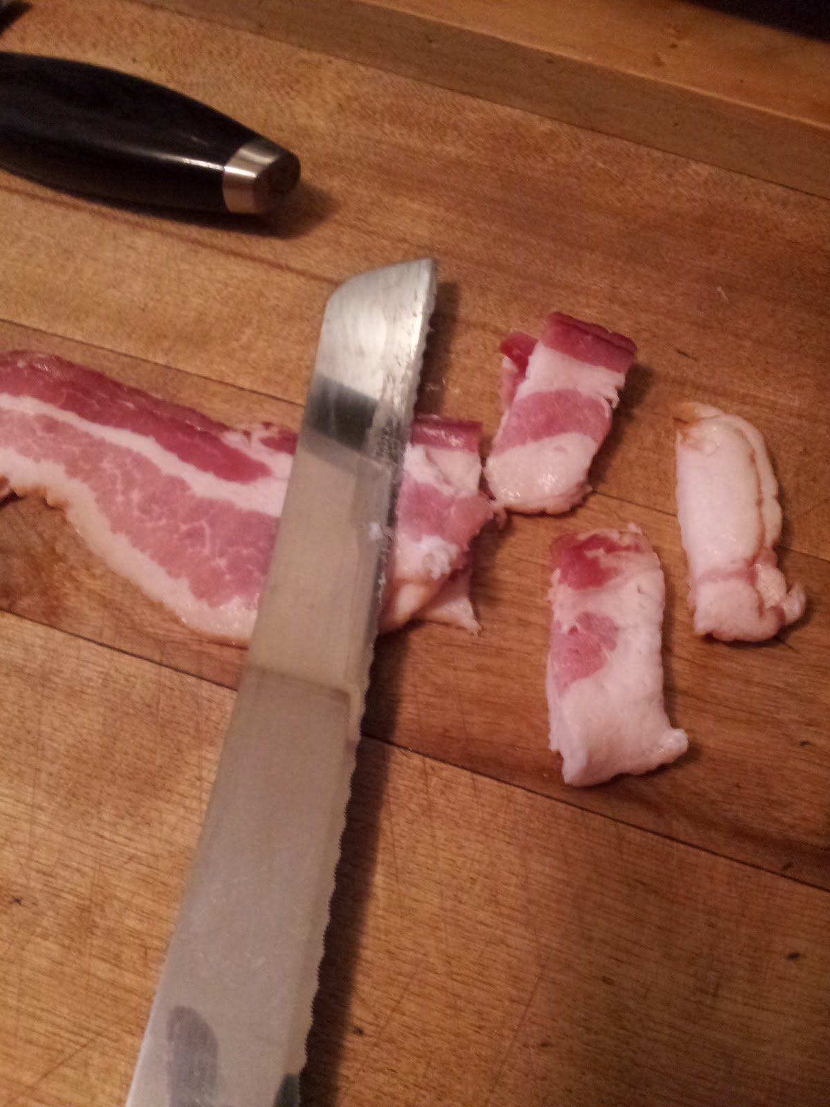Heat up a large non-stick skillet. Slice the bacon into 1/2 inch pieces, throw straight into the pan and lower the heat to a medium flame. I find using some sort of serrated knife helps to cut the bacon easier.
